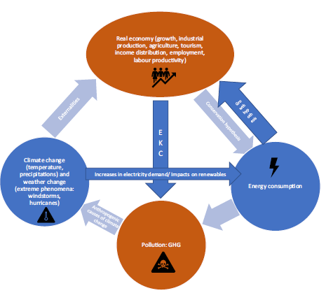 The links between climate change and economic activity have a critical relevance for the well-being of future generations. Consequently, many publications are devoted to understanding and measuring them. This paper is a comprehensive survey of recent contributions using econometric methods. We update previous surveys focusing on partial aspects of the complex relationships linking the economy and climate change. Starting from economic activity, the channels that relate it to climate change are energy consumption and the consequent pollution. Hence, we first describe the main econometric contributions of the interactions between economic activity and energy consumption, then explain the contributions and interactions of economic activity to pollution. Finally, we look at the main results on the relationship between climate change and economic activity. A necessary consequence of climate change is the increasing occurrence of extreme weather phenomena. Therefore, we also survey contributions on the economic effects of catastrophic climate phenomena.